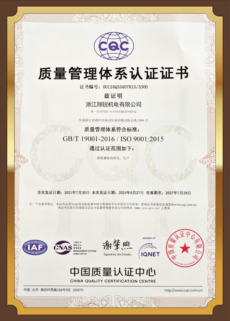 2021年新建浙江南浔锚栓生产基地(浙江翔锐机电有限公司),生产厂房面积22000平方米。