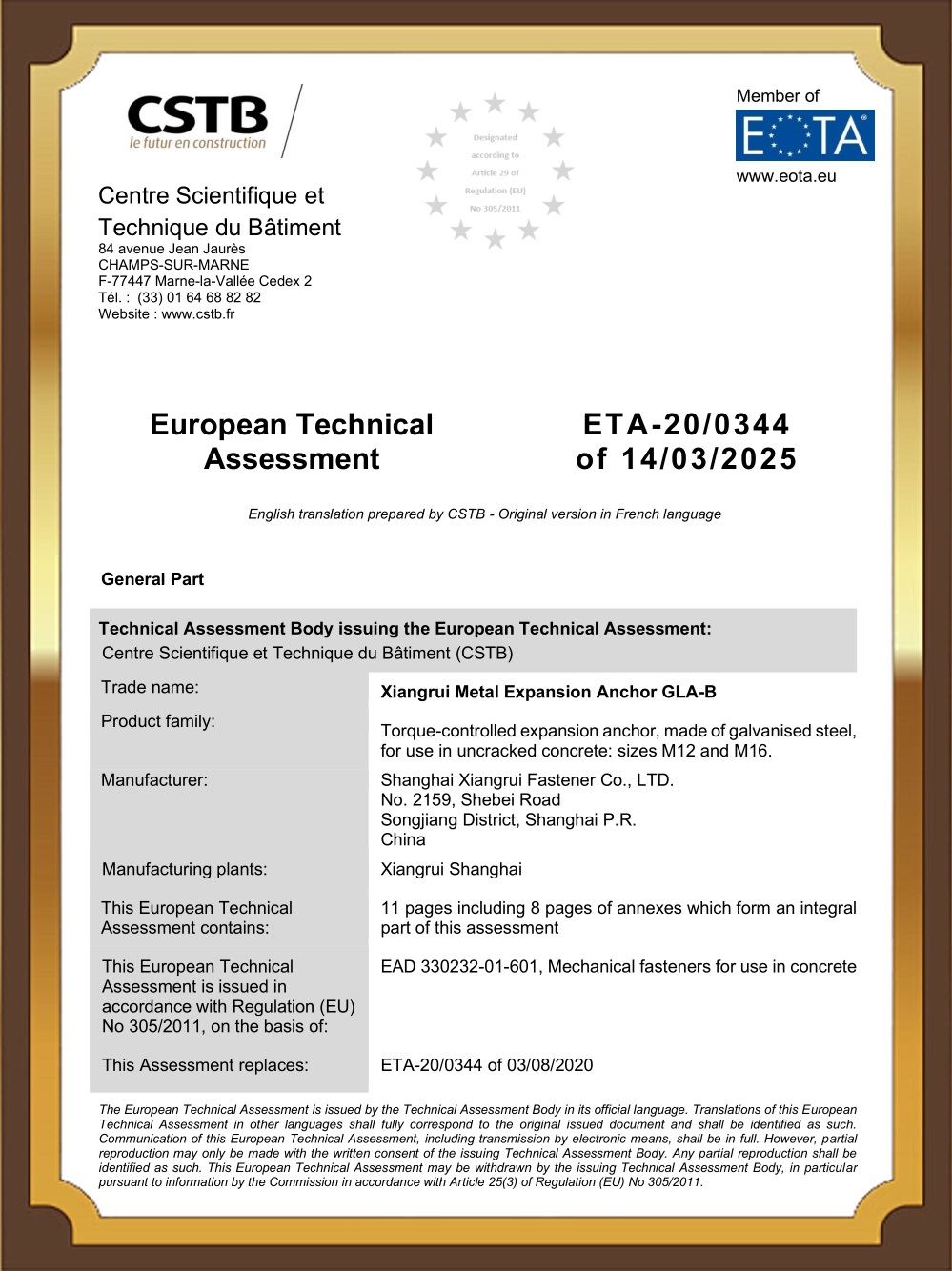 2020年GLA-B锚栓产品通过欧盟ETA认证。